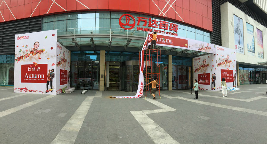 丹东万达百货秋季新品活动展板吊旗 喷绘布安装